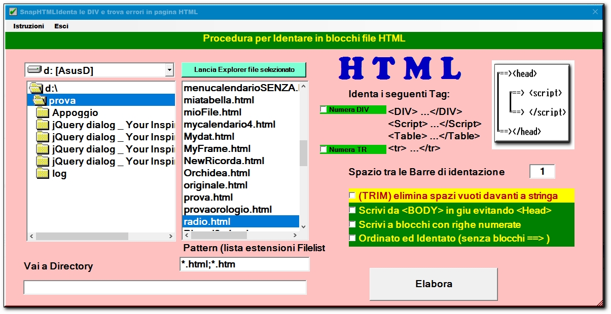 IDENTAZIONE HTML Si sceglie un file da elaborare dalla sua directory e si scelgano le opzioni date dai vari checkBox: